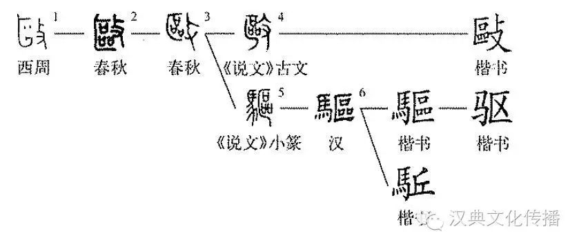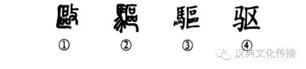 这是“为渊驱鱼”的“驱”字,本为形声字。①是石鼓文的形体,左“区”右“支”,表示“扑打”、“驱赶”。②是小篆的形体,将“支”改为“马”,亦有道理,这同样是表示“赶马”的意思。③是楷书繁体字。④为简化字。
