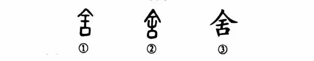 这是“客舍青青柳色新”的“舍”字。我们看金文①的上部就像屋顶(两面坡),中间的“干”形部分就是顶柱与横粱,下部“口”即为砖石砌的墙基。由此可见,“舍”的本义就是房屋,亦称房舍。②是小篆形体,其它各部分均同于金文,仅“干”形的第二横改为向上弯曲。这不仅美观,而且也很像庙宇中的斗拱,这样的房屋是很结实的。楷书③的形体基本上同于金文。
