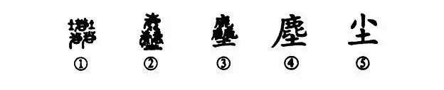 这个“爷娘妻子走相送,尘埃不见咸阳桥”中的“尘”字是个会意字。①是“尘”字的籀文形体(见《说文解字》),其中有三只鹿,在上面一只鹿的两侧是两个“土”字,这就表明群鹿奔跑,尘土飞扬,可见这是个会意字。小篆②则减少了一个“土”字,把余下的一个“土”移到三只鹿的脚下,这就更为形象地表明了群鹿奔跑扬起尘土的意思。楷书③是直接由小篆变来的,但笔画太多,所以后来又减少了两个鹿,变成了楷书④的形体。⑤是新简化的会意字,“小土”谓之“尘”,这是很有道理的。