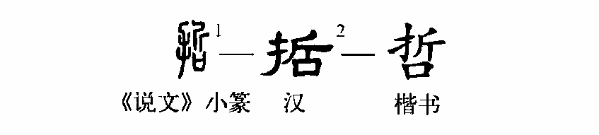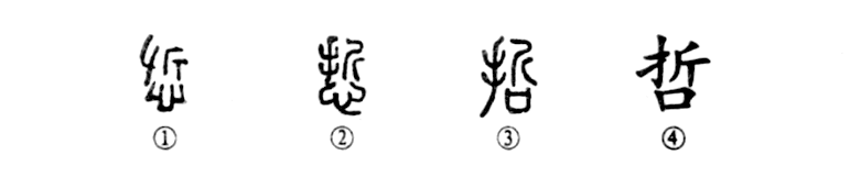 这是“知人则哲”的“哲字”,本为形声字。①是金文的形体。其上部为“折”,表音,下部为“心”,表意,表示“聪明”之意。②是小篆的形体,直接由金文变来。③为小篆的异体字,将“心”换成“口”,其义未变。④为楷书的写法。