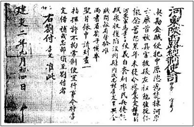 今存宋高宗建炎二年(1128)河东路抗金义军的五份文件中,有四份都有一个官员的押字。1966年初,山西灵石县农民在山间石缝中发现一只铜罐,内藏五份白麻纸文书。第一份是讃延路经略安抚使王庶颁发给义军首领李实的札子,札子宣称李实为“借补进武校尉”,时间为“建炎二年正月初八日”,在“初八日”之下有一押字,显然是讃延路经略使王庶的押字。(见抗金义军借补官等文书之一)。第三、第四份是都统河东路军马安抚使司颁发给李实的札子。第三份(见抗金义军借补官等文书之二)称李实为保义郎。第四份(见抗金义军借补官等文书之三)称李实由保义郎“转补成忠郎”,时间为“建炎二年八月二十四日”。这两份札子在左下端各有一个官员的押字,两个押字相同,显然是都统河东路军马差遣安抚使李宋臣的花押。第五份(见抗金义军借补官等文书之四)是河东陕西路经制使司颁发给李实的札子,宣称成忠郎李实为“借补成忠郎”,时间为“建炎二年九月初四日”。札子左下角也有一个长官的押字,估计是河东陕西路经制使的押字。