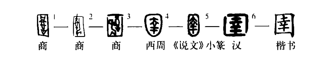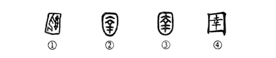 这是“陷于囹圉”的“圉”字,读作yǔ,本为会意字。①是甲骨文的形体,内部是一个面朝右跪着的人,双手戴着刑具,外部是囹圄(牢狱)之形,表示犯人被关进监牢之中。②是金文的形体,内部的“人”形已省掉了,仅存一刑具。③是小篆的写法。④为楷书的形体。