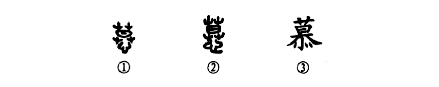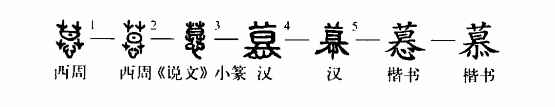 “慕风而就山,慕水而就川。”这个“慕”字是个形声字;金文①的上部是个“莫”字,日落草中,表示太阳下山了;其实“莫”就是“暮”字的初文,不过它在“慕”字中只表读音,而下部的“心”字才是表意的。这样,“慕”字就成了上声(莫)下形(心)的形声字了。②是小篆的形体,与金文的结构完全一致。③是楷书的写法。“心”字如在一个字的下部,有时写作“”,除了“慕”字以外还有“恭”字。从笔画的数目上看,“心”与“”均为四笔,只是笔形上有些差异。