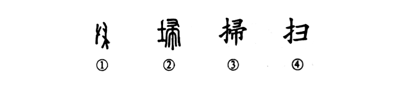 “扫荡六合清,仍为负霜草。”这个“扫”字本为会意字。甲骨文①的右边是一把扫把,左边是一只手,表示扫除尘土。②是小篆的形体,扫把仍在右边,左边换成“土”,以帚扫土,仍为扫除意。③为楷书繁体字,又将“土”换成“手”,为以手持帚扫除之意。④为简化字。