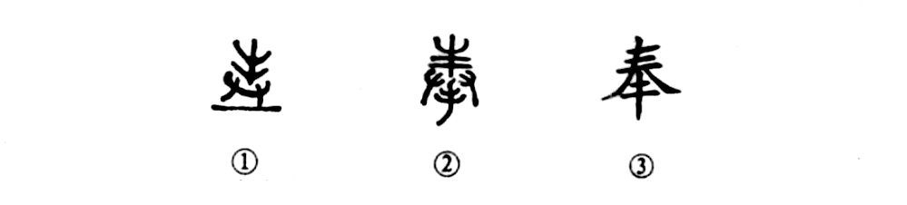 这个“奉”字本为会意兼形声的字。①是金文的形体,上部为“丰”,表声,也表示所捧之物;下部为两手形,表示双手捧物。②是小篆的形体,其下部为三手之形。③是楷书的写法。