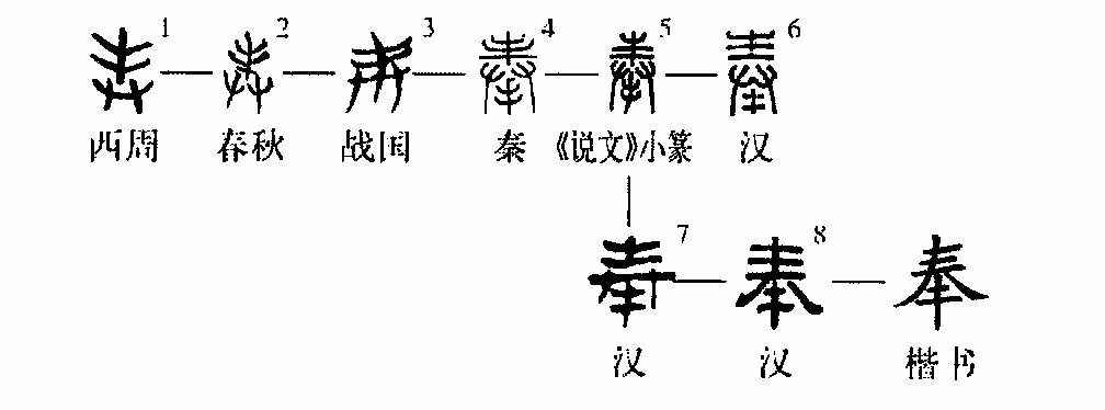 ”、 “奉”、 “捧”是一字之增益,是表义偏旁“手”不断累增的结果。“奉”与“承”的演变过程很相似,可与“承”字条互参。隶、楷“奉”字下部的“