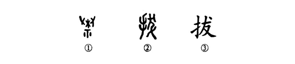 “力拔山兮气盖世。”这个“拔”字本为会意字。甲骨文①上部为左右两只手,中间是一棵树。于省吾先生认为“象两手拔木之形”。即古“拔”字。②是小篆的形体,变成了“从手,发声”的形声字了。③为楷书的形体,直接从小篆变来。