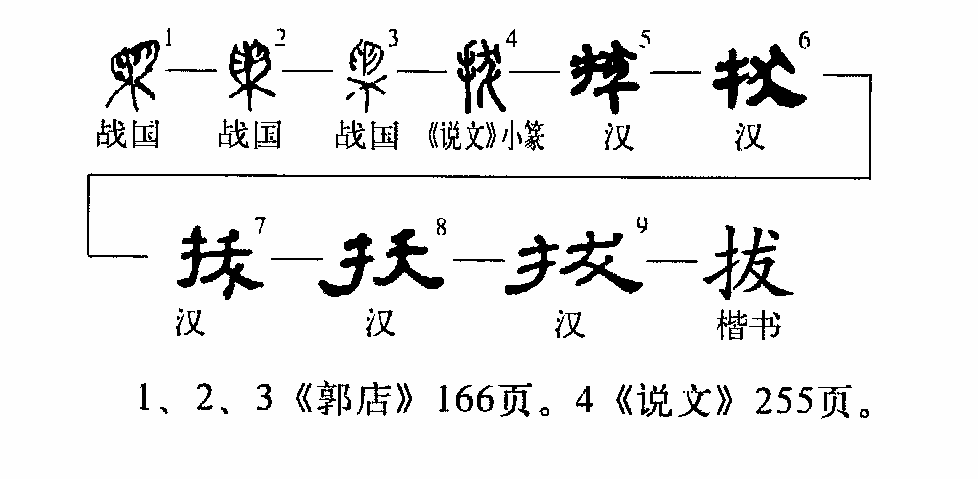 ”、 “夭”等形。本义是抽拉,连根拽出。《易·泰》:“拔茅茹以其汇。”王弼注:“茅之为物,拔其根而相牵引者也。” 《史记·项羽本纪》:“力拔山兮气盖世。”引申为选拔,超出,吸出(毒气)等义。以上义项读bá。又指一种草名,即龙葛,读fá。(方东杰)