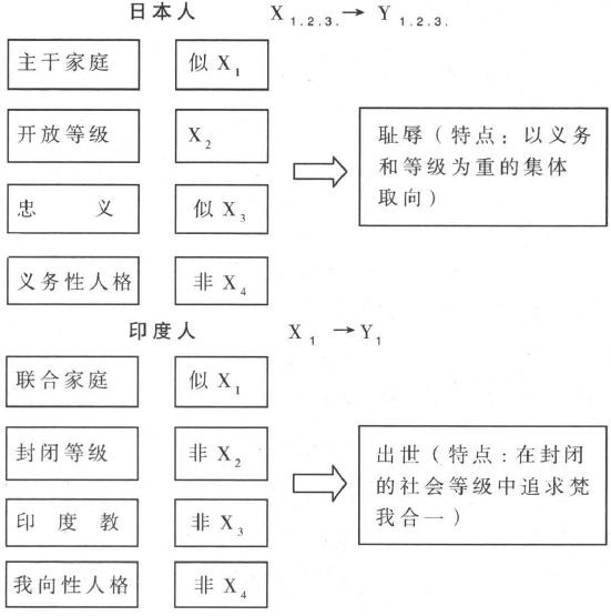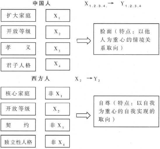 不否认,这种比较有很多合理性,但也似乎隐含了一个历时的过程,也就是说,作者在前面借用Durkheim、Tonnies、Parsons等社会学家的观点时,包含了传统和现代的比较。这无疑是在肯定西方传统社会中的人也会有脸面心理,只是它们在现代化的过程中摒弃了脸面。而本书的比较则是把西方传统和中国传统作比较,得出西方人没有这种心理。值得注意的是,我在比较和推论中强调了X↓1↓↓对形成脸面的重要性。这点在墨西哥人的研究中已经证实。为了在下面突出中国人脸面的特色,我们主要和西方文化作比较。